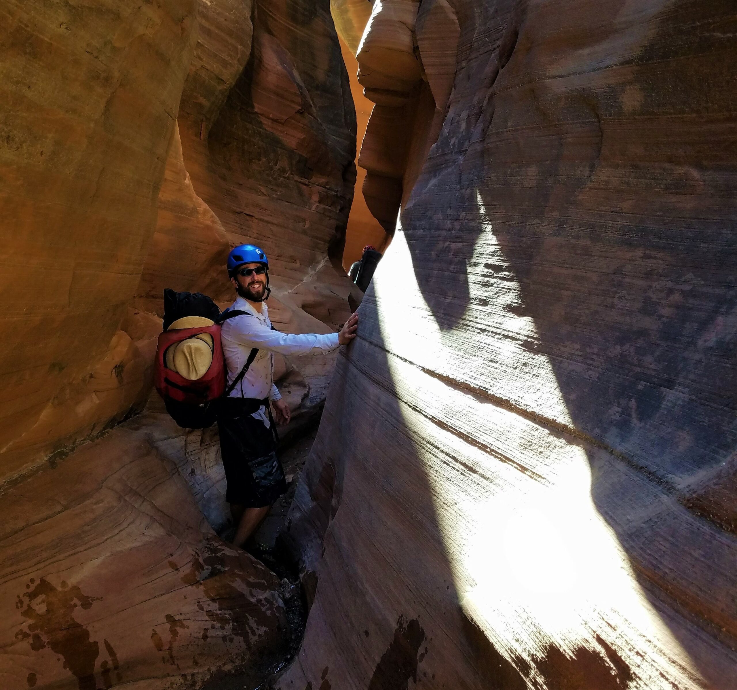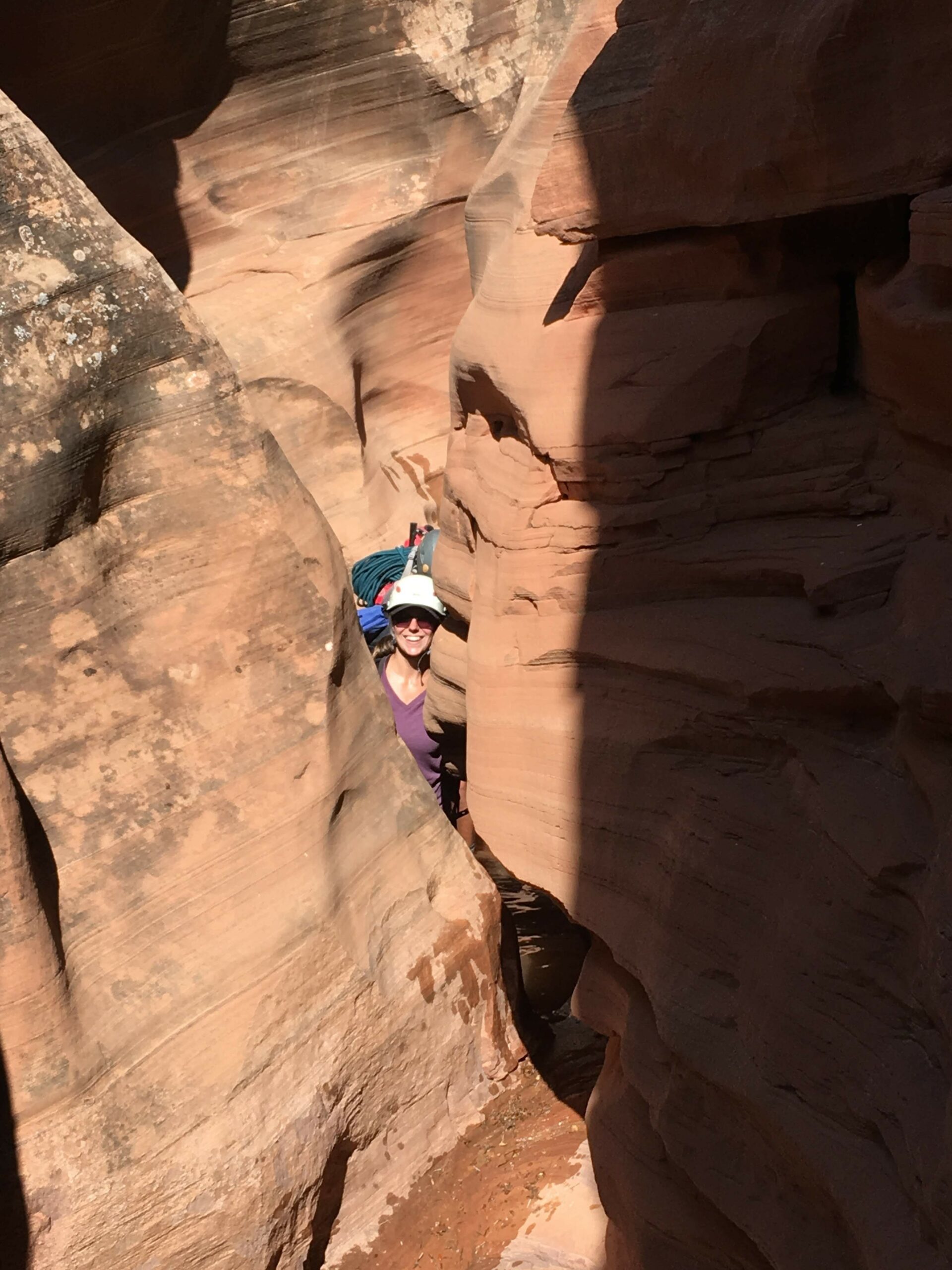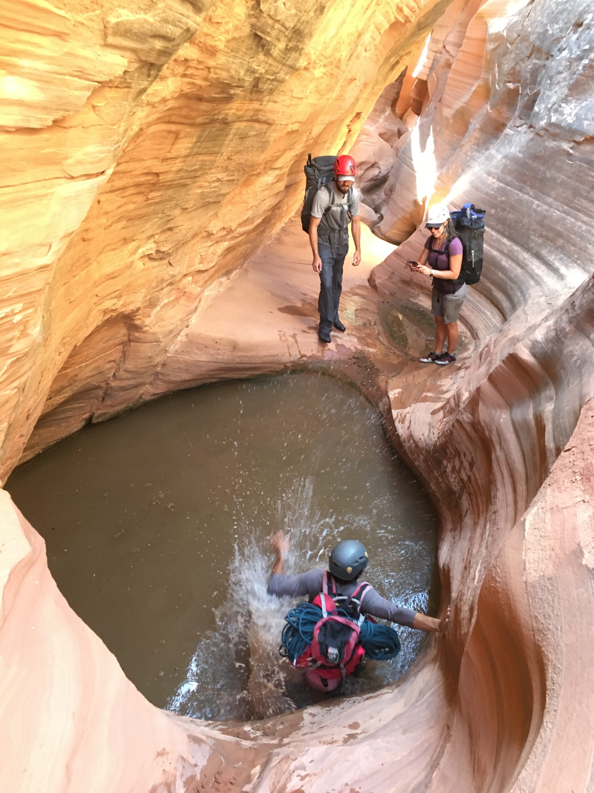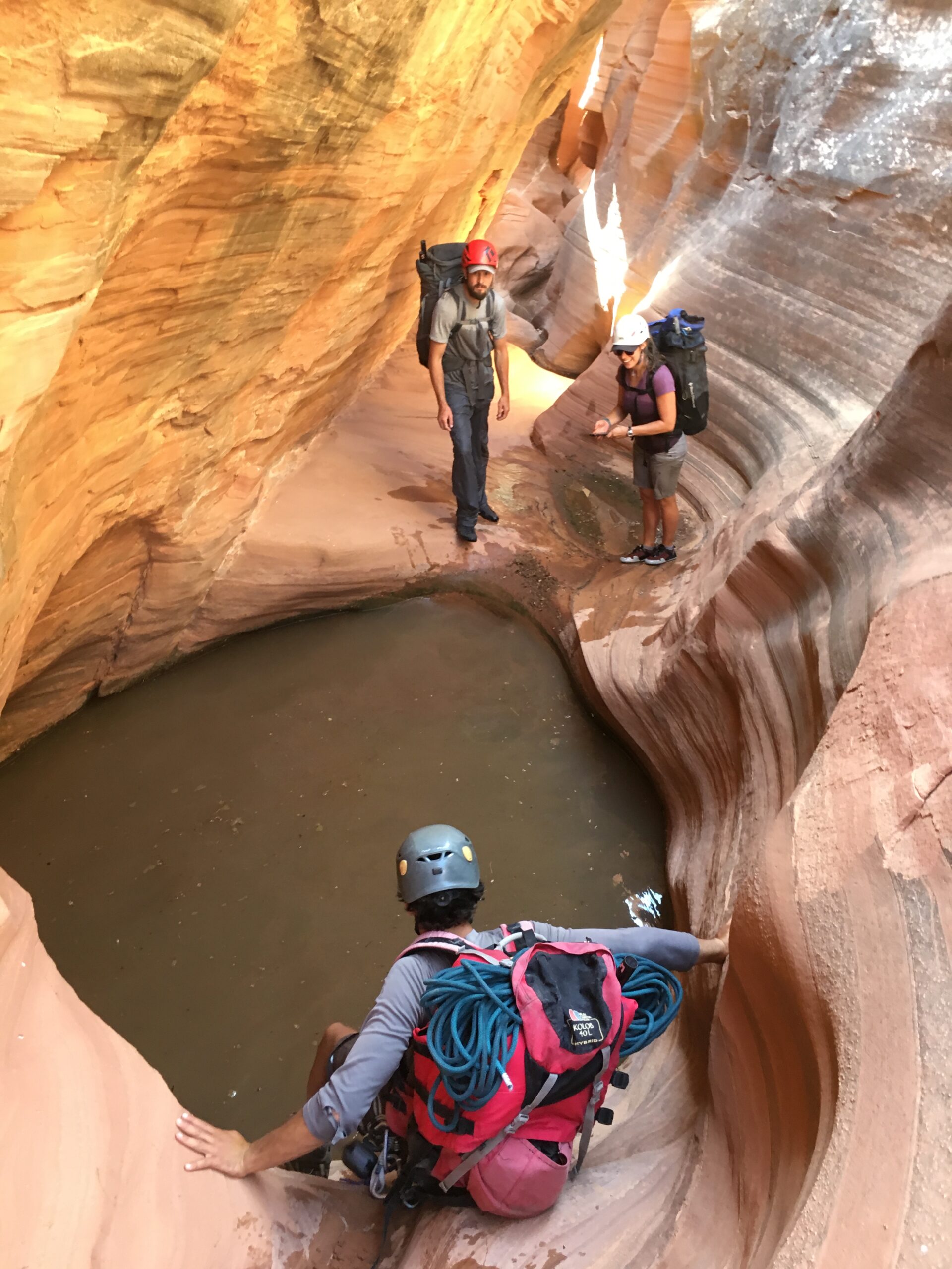 That’s right! We must squeeze and wade through narrows and pools to reach the first of two rappels. At 85’, the first rappel is simple and straightforward, offering a great intro or refresher. Avoiding the heart shaped pool half way down, we finish the rap, landing in soft sand.