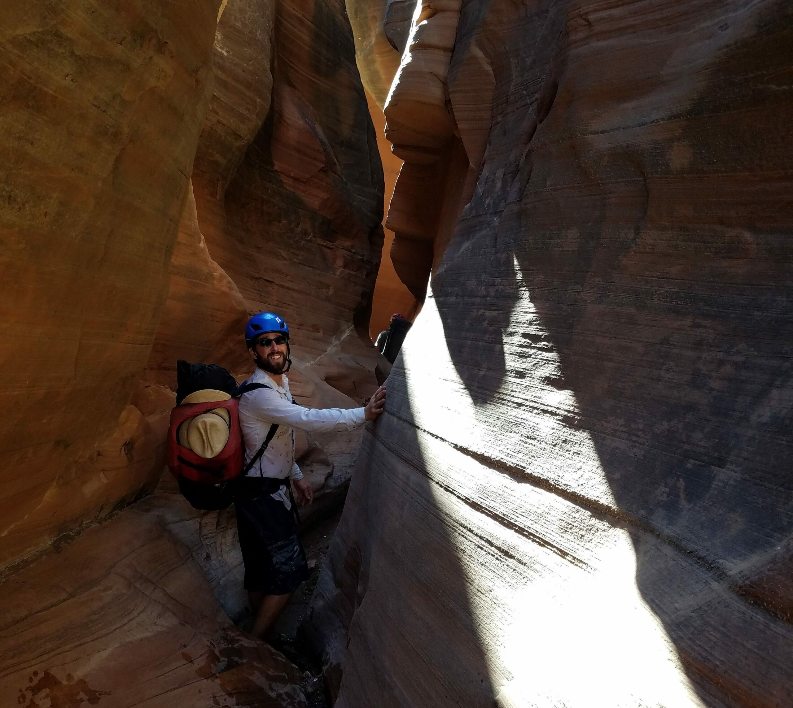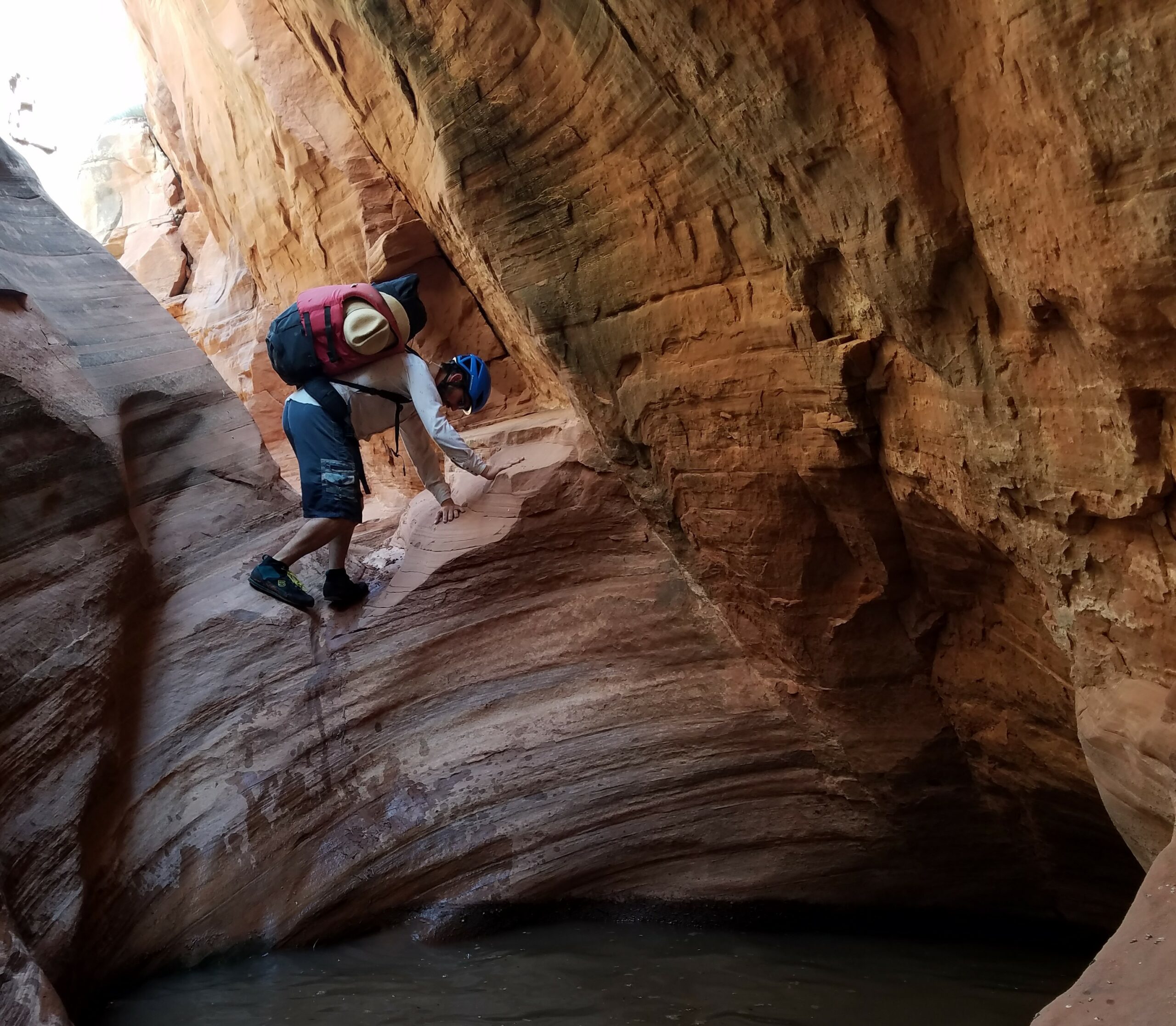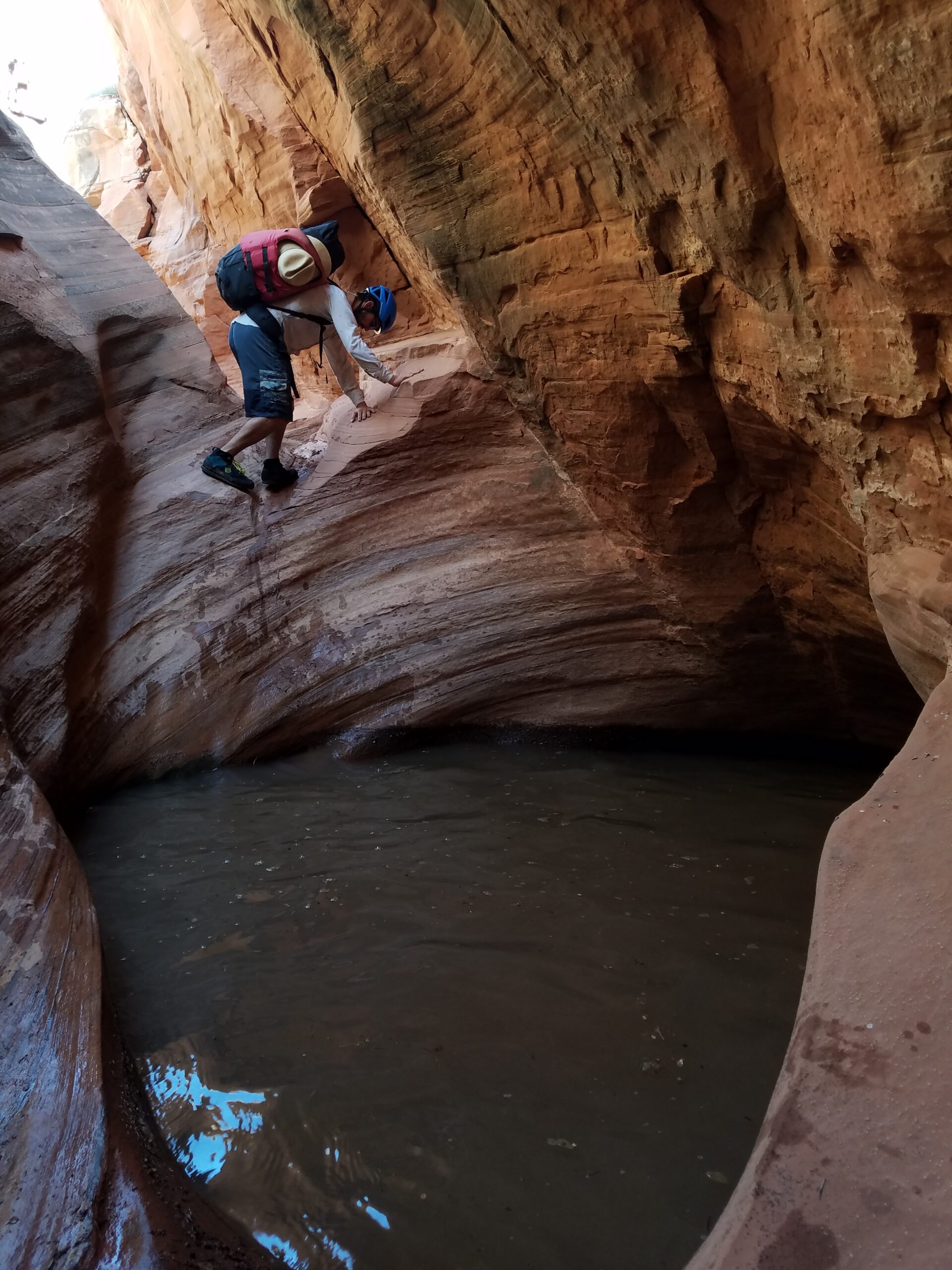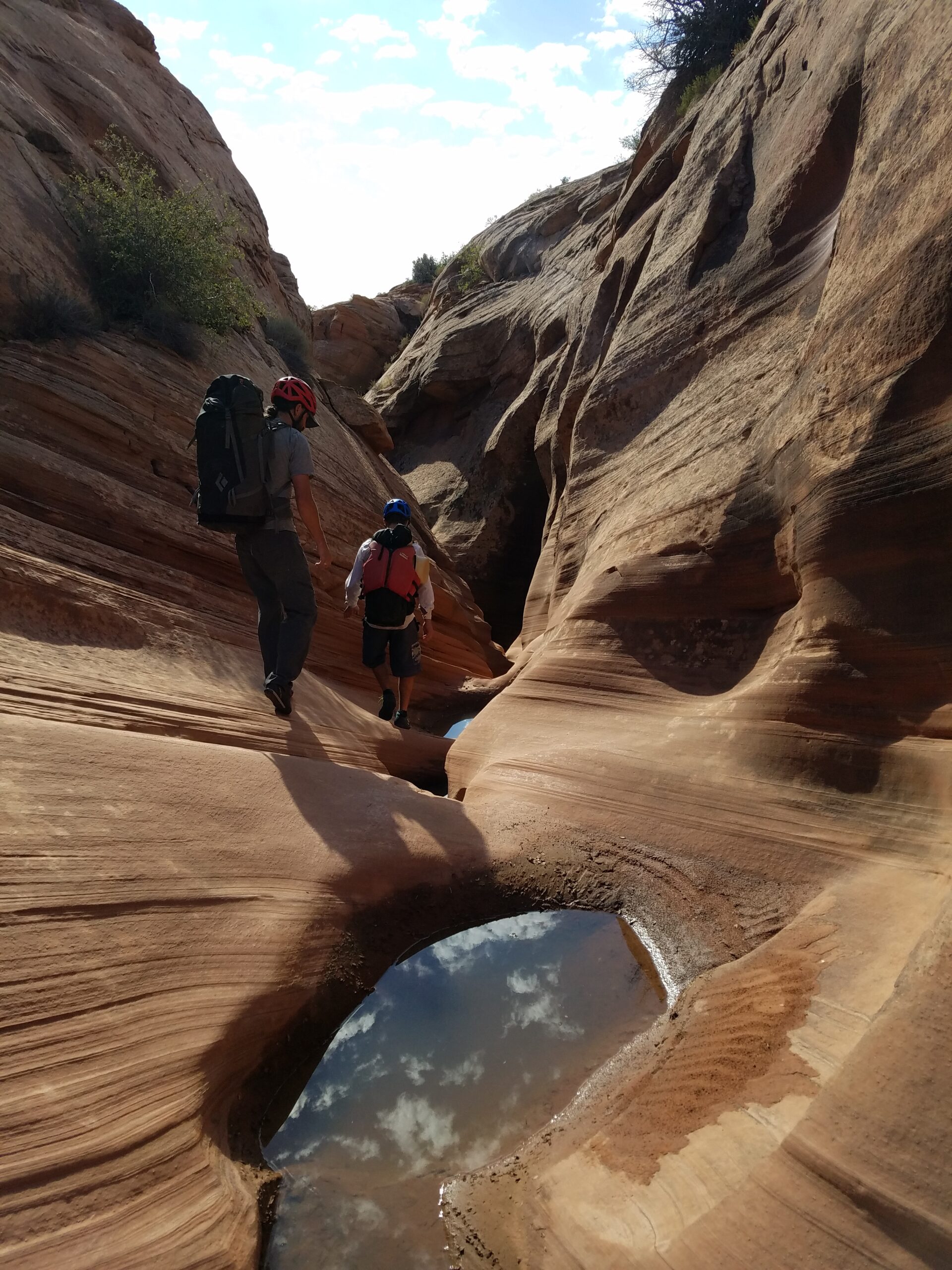 That’s right! We must squeeze and wade through narrows and pools to reach the first of two rappels. At 85’, the first rappel is simple and straightforward, offering a great intro or refresher. Avoiding the heart shaped pool half way down, we finish the rap, landing in soft sand.