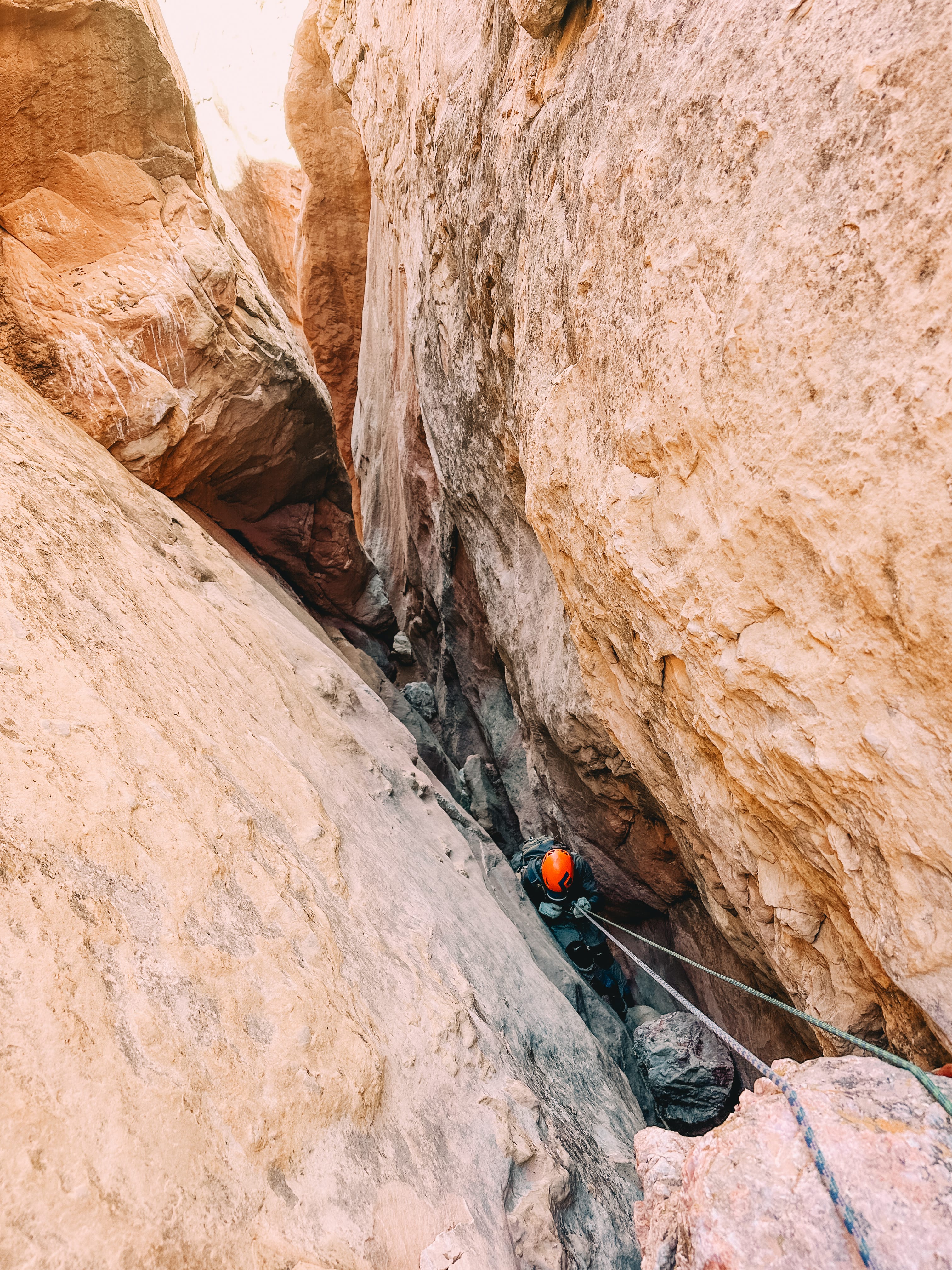 Soak up the sun on the Navajo sandstone ledges as you prepare for the second, and largest rappel right after the first- another 165 ft lower! From here, we’ll descend even further- navigating small boulders, and doing a few short and fun downclimbs.