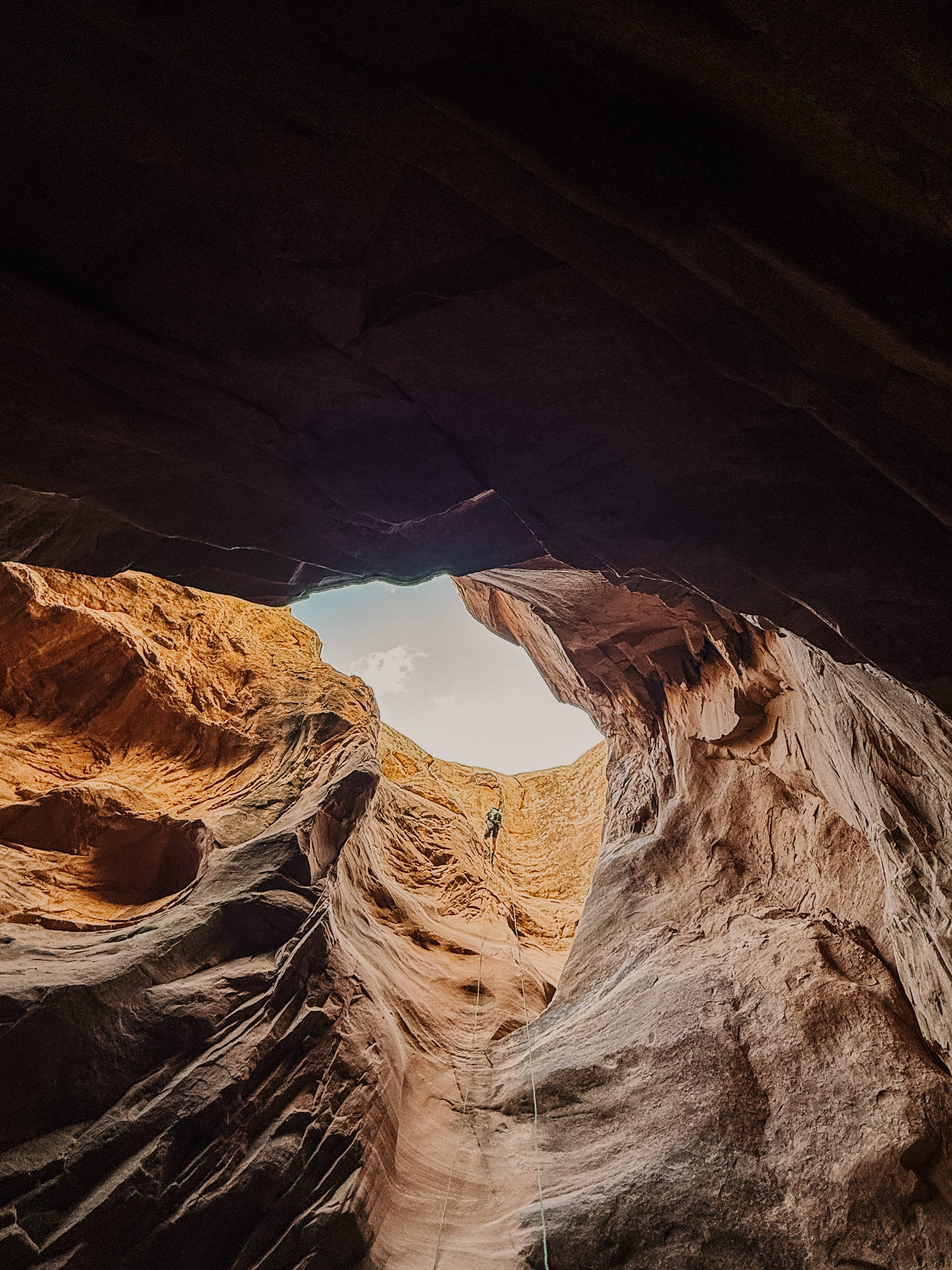 At the bottom you’ll probably think you’re in a different world than the others still at the top. You’ll probably also think that the rappel wasn’t as terrifying as you thought it would be! Behind you, the Keyhole, a subtle and narrow passageway, provides an escape from the Chamber’s seemingly exitless confines.