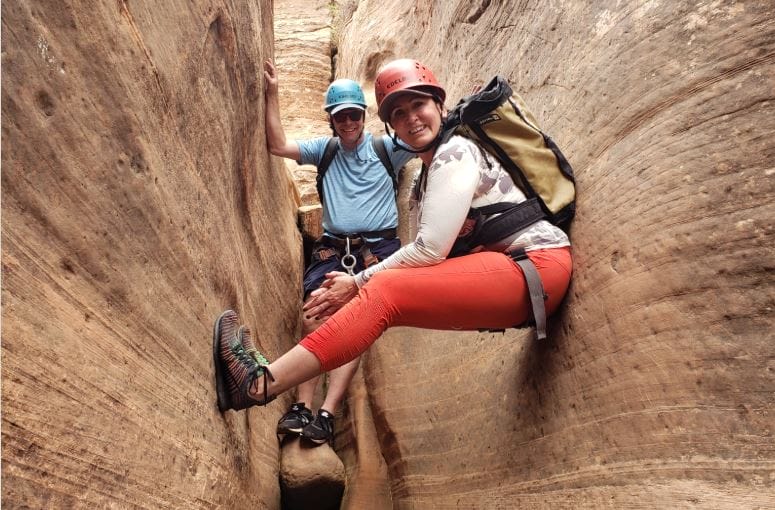 From here, we’ll wade through a pool or two of water (depending on recent rains), chimney, shimmy, scoot and climb our way through the narrows. We’ll reach another rappel at 50 feet and our final rappel at 100 feet. Feel the air under your feet as you descend this final free-hanging drop!