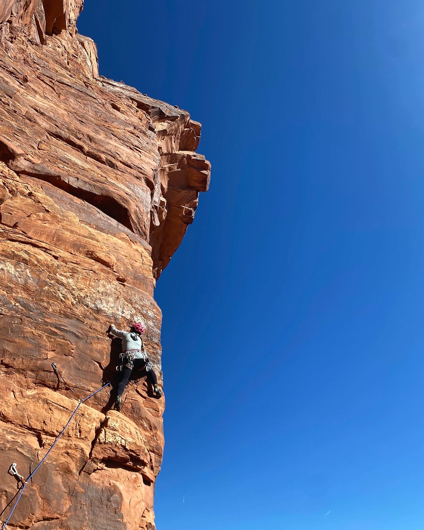 A “pitch” is a set length of climbing that ends at a set of anchors where your guide will stop and belay each person in the group up to them. From there, the guide continues up the next “pitch” to another set of anchors and belays each person up the them again. We repeat for another pitch until you’re on top of the rim!
